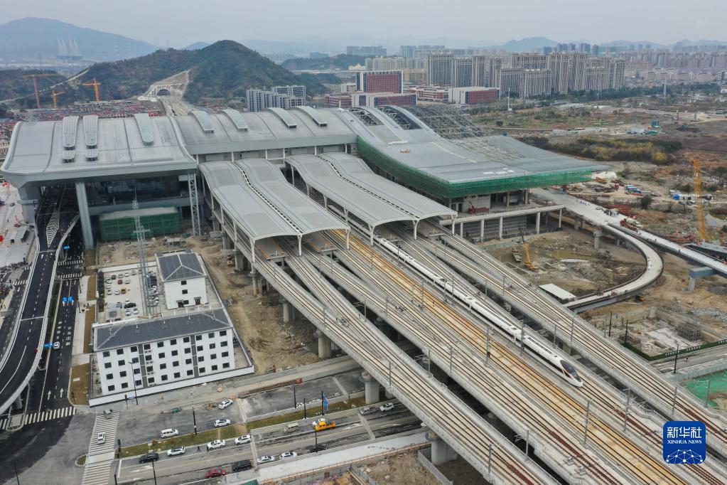 1月8日,从嵊州新昌站开出的杭台高铁首发列车停靠台州站后驶出,开往温岭方向(无人机照片)。新华社记者 黄宗治 摄