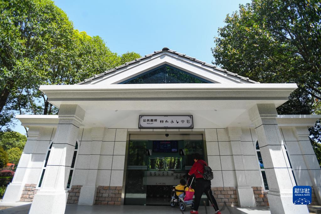 市民带着小朋友进入位于湖南长沙县星沙中心广场的智慧厕所(2021年3月24日摄)。新华社记者 陈泽国 摄