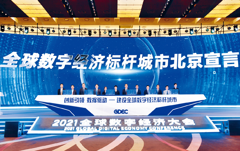 2021年8月2日,2021全球数字经济大会在北京国家会议中心举行。图为《全球数字经济标杆城市北京宣言》在大会主论坛上发布。 中新社发 2021全球数字经济大会供图