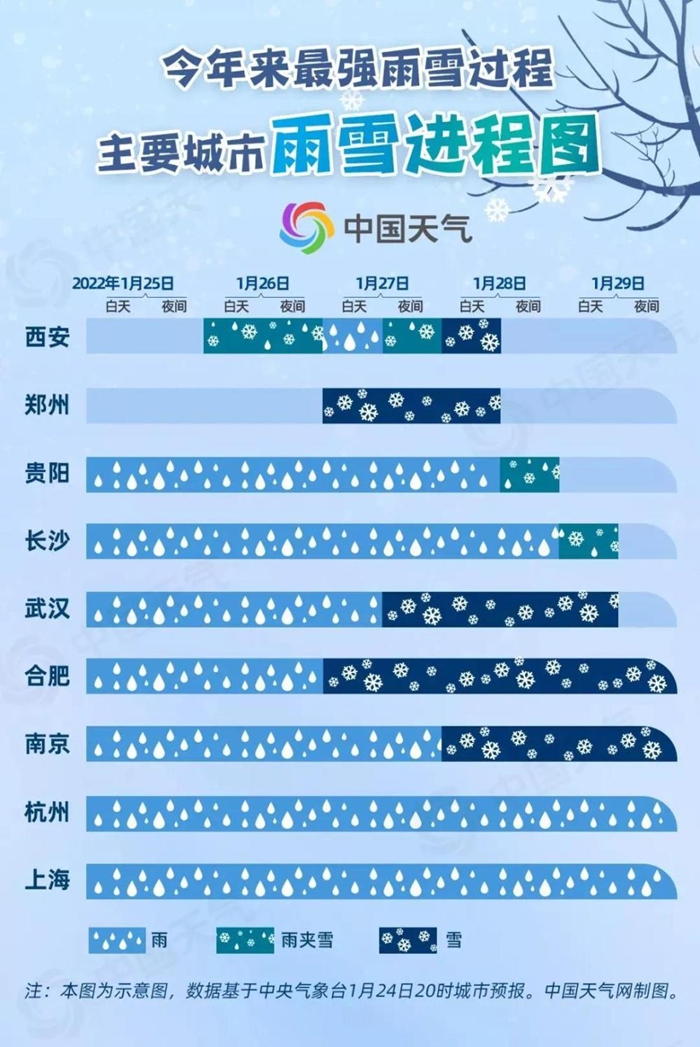 1月26日,中央气象台发布2022年首个暴雪蓝色预警。26日至29日,大范围雨雪覆盖20余省份,8省部分地区有大到暴雪,局地有大暴雪或特大暴雪。