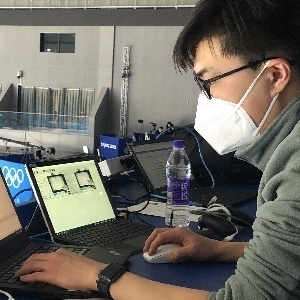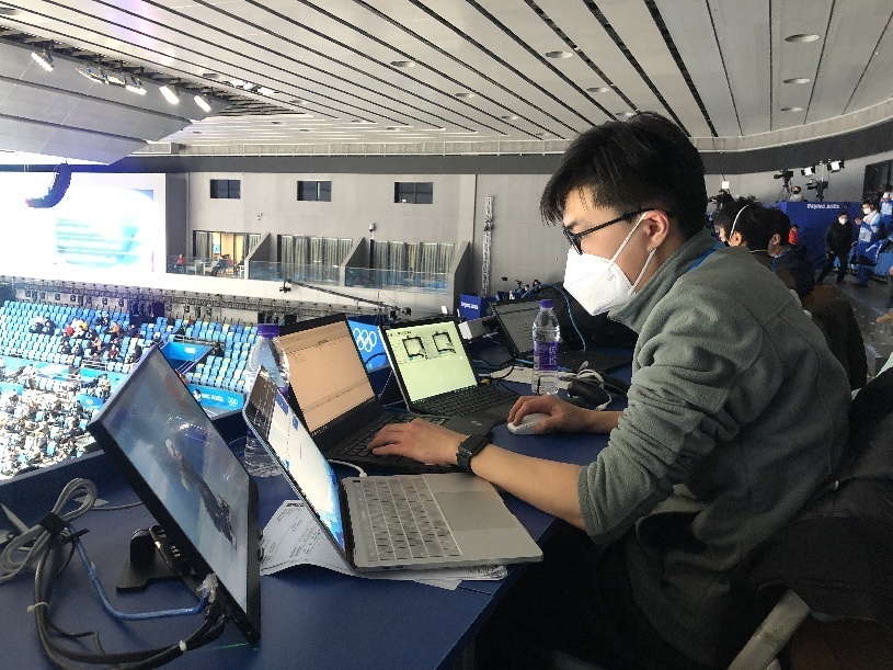 早在1月,新华社摄影团队和技术团队的施工人员就进入奥运闭环,在首都体育馆吊装的桁架上安装了2台遥控云台相机,其中一台位于场地中心主形象景观正上方,另一台位于短道终点正上方。两台相机各有侧重又互相补充,基本可以无死角覆盖场内的各个角度。与手持相机拍摄的最大不同是遥控云台相机需要使用电脑软件控制,对于调整角度和曝光等操作要求更复杂。5日下午5点,虽然距离晚场开赛还有两个多小时,各路记者已经将首都体育馆本就不大的媒体工作间围得水泄不通。抵达场馆后,我抓紧时间赶到看台最高层的遥控云台相机操控席位调试设备,竞赛区域从这里看去一览无余,对于操作遥控云台相机来说是最好不过。
