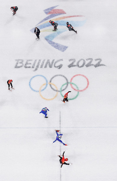 ↑2月5日,中国队选手武大靖(下)在比赛中冲过终点。当日,北京2022年冬奥会短道速滑项目混合团体接力决赛在首都体育馆举行。新华社记者 徐子鉴 摄