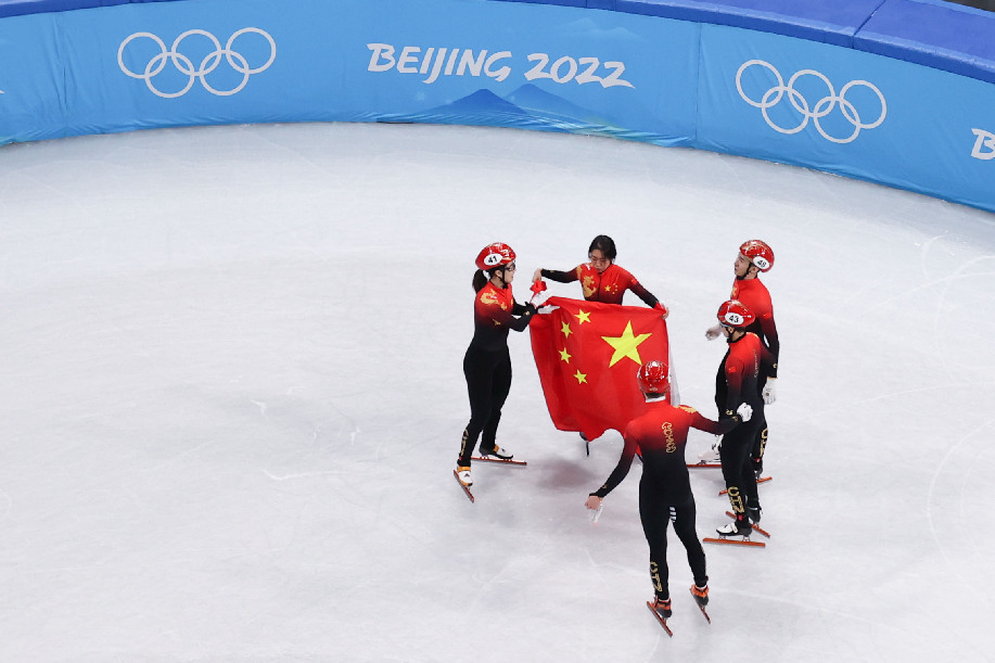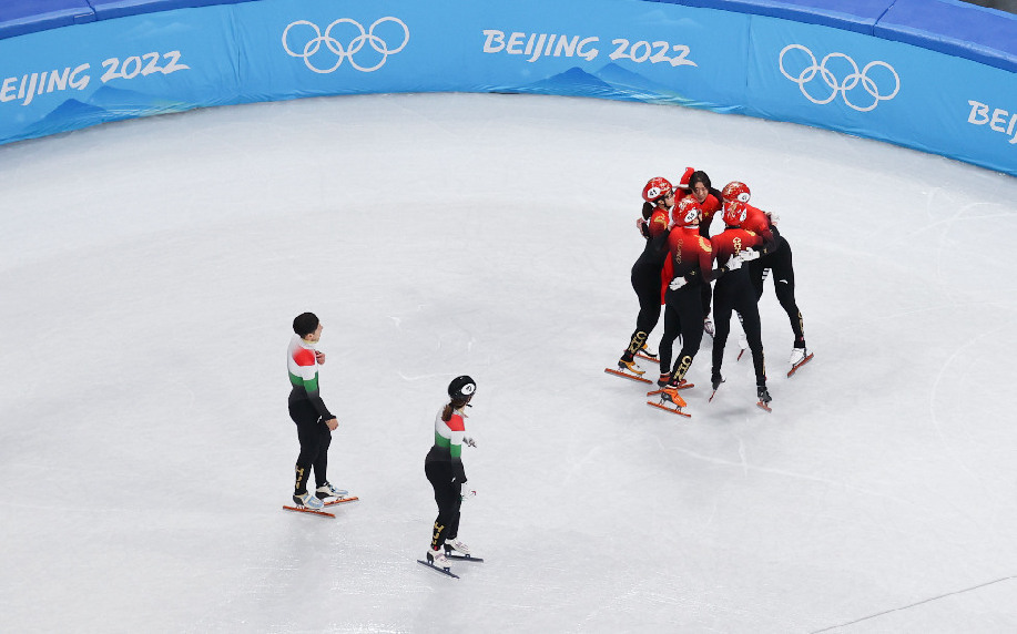 ↑2月5日,中国队选手在短道速滑项目混合团体接力决赛比赛后庆祝。 新华社记者 徐子鉴 摄