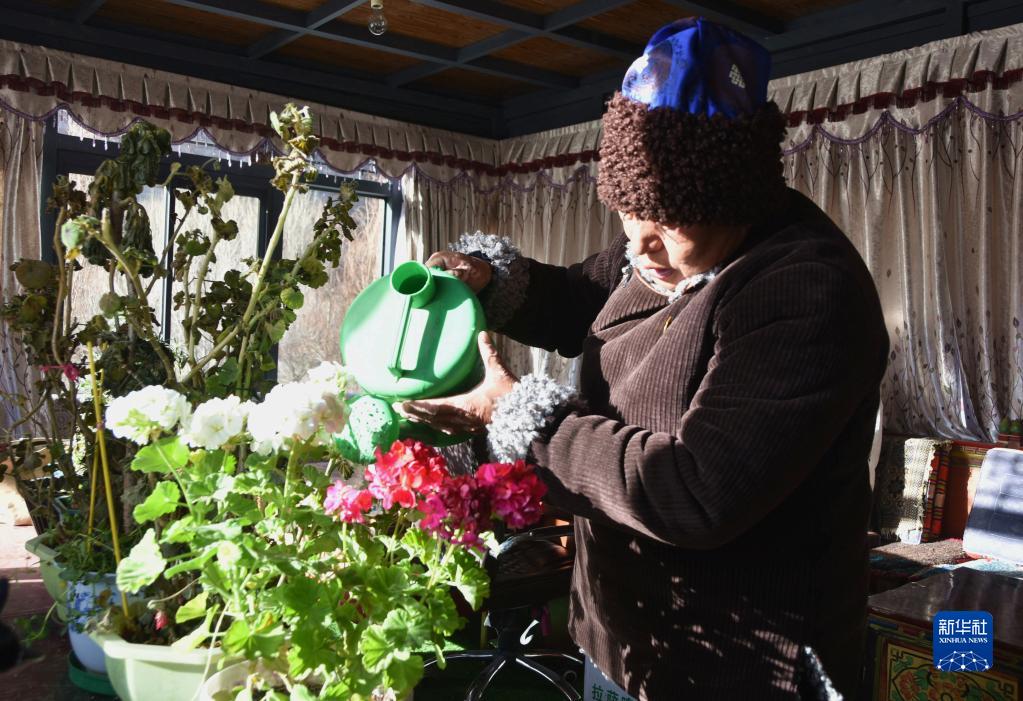 西藏洛扎县嘎波社区扎麦村村民达瓦次仁在给阳光房里的盆栽浇水(1月19日摄)。新华社记者 陈尚才 摄