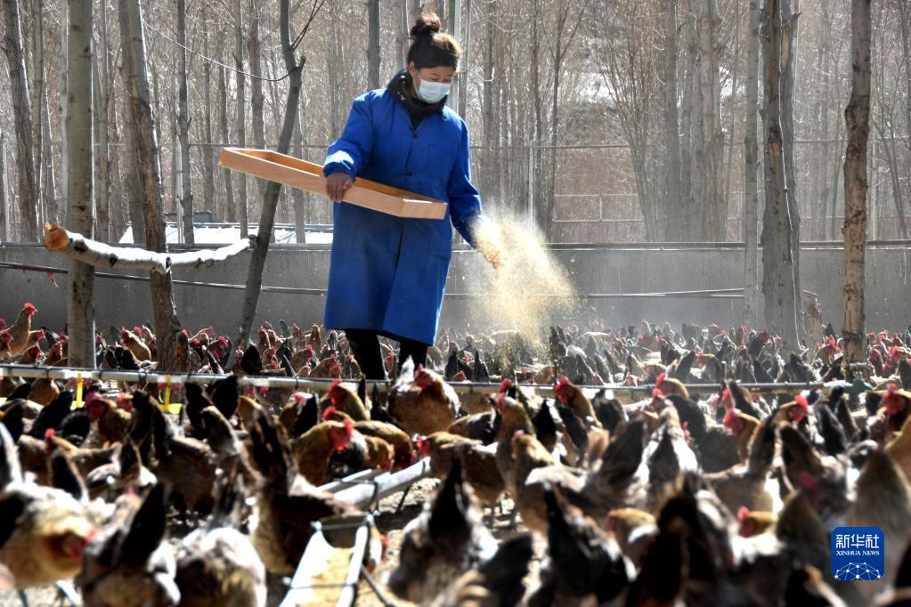 西藏洛扎县次麦藏鸡养殖合作社工作人员在给藏鸡喂食(1月19日摄)。新华社记者 陈尚才 摄