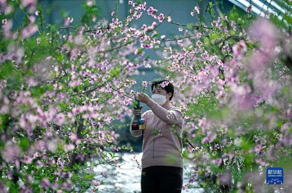 2月15日,宁夏青铜峡市大坝镇韦桥村村民李文会在日光温室为桃树疏果、剪枝。新华社记者 王鹏 摄