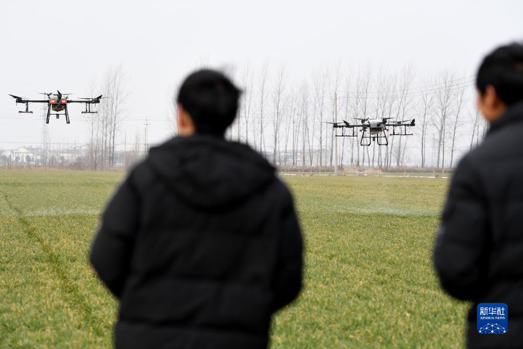 2月11日,无人机在安徽省亳州市赵桥乡“无人农场”喷洒除草剂。新华社记者 刘军喜 摄