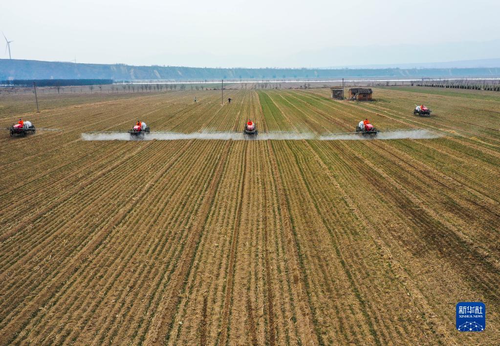 黄河滩地边,孕育着万亩麦田,十多辆高地隙植保车齐头并进,喷洒着叶面肥和植物生长调节剂,让急需营养的小麦苗饱尝甘霖。“往年这个时节,老百姓只需要打除草剂,今年得多打两次肥料。”山西省运城市芮城县农机手孙亚新说。
