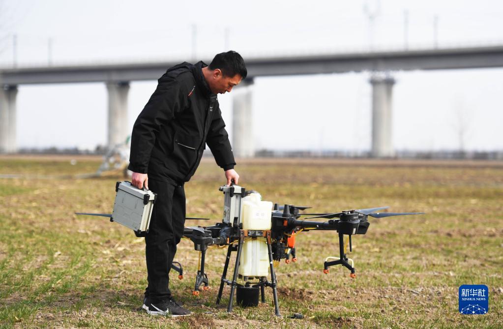 2月17日,在河南省安阳市汤阴县伏道镇,农技人员为植保无人机更换电池。新华社记者 张浩然 摄