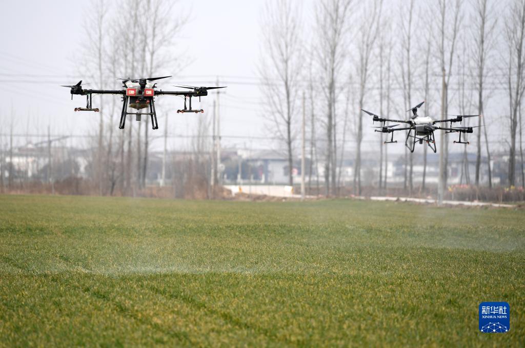 2月11日,无人机在安徽省亳州市谯城区赵桥乡“无人农场”喷洒除草剂。新华社记者 刘军喜 摄