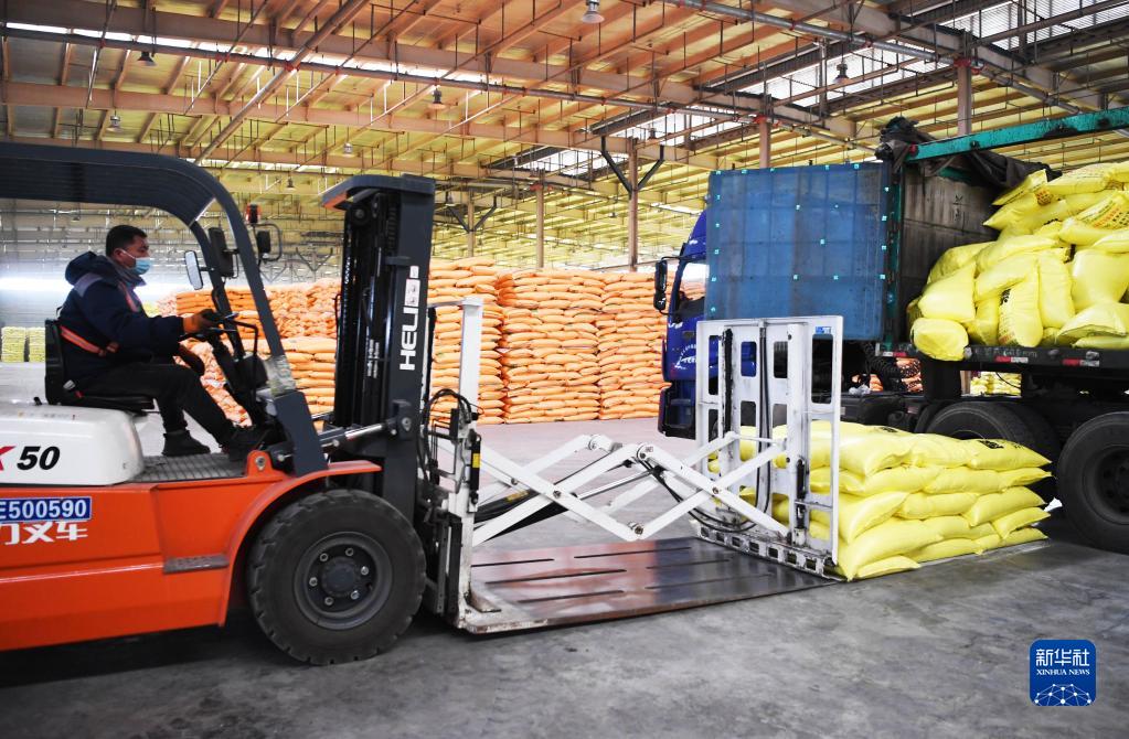 2月17日,工人在位于河南省安阳市汤阴县伏道镇的河南万庄安阳物流园装运储备化肥。新华社记者 张浩然 摄