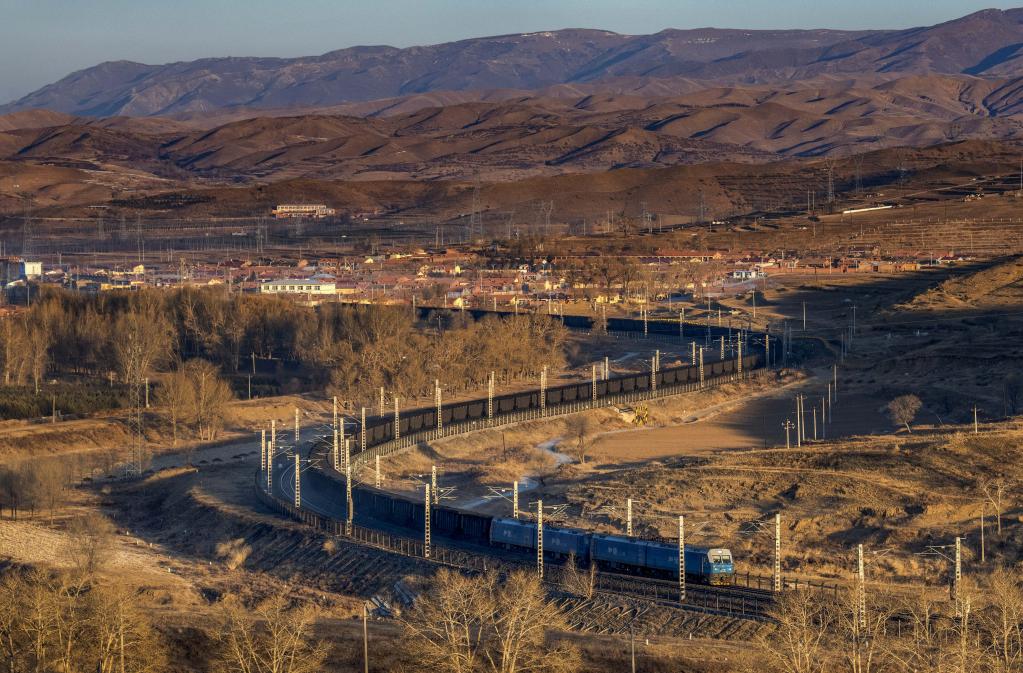 2021年12月23日,一列万吨煤炭列车行驶在内蒙古乌兰察布市卓资县境内。新华社发(纪恩泉摄)