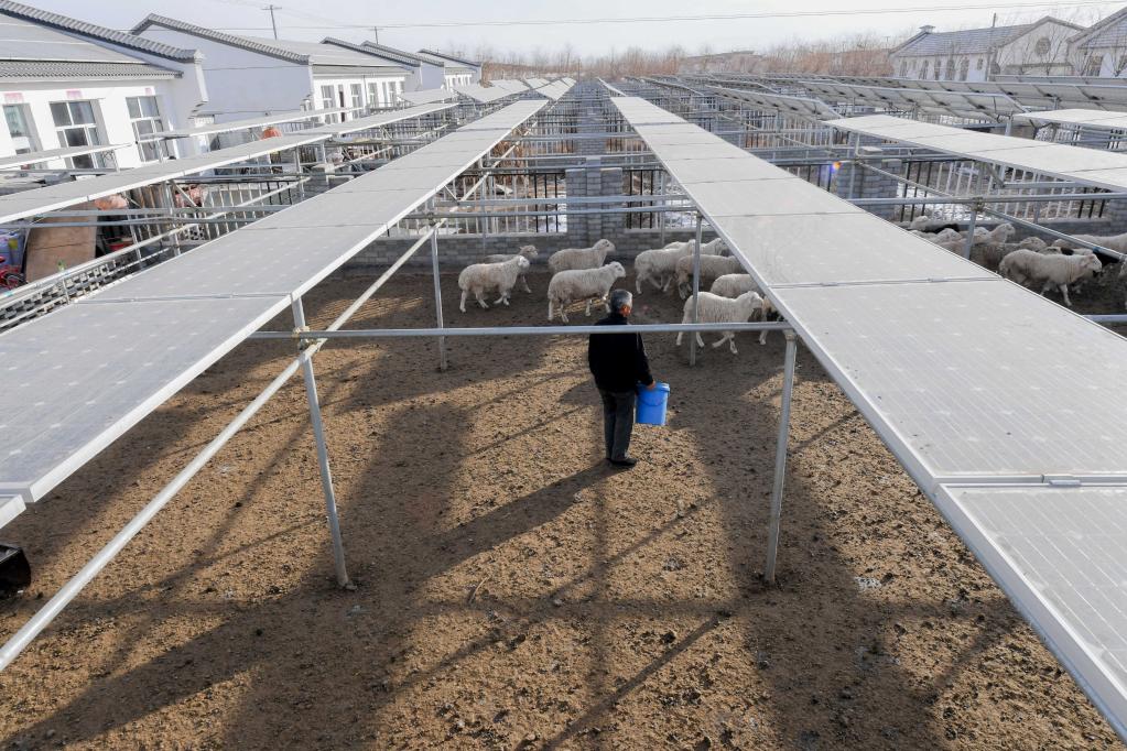 联星村村民在自家的光伏庭院里饲养羊群(2018年1月22日摄)。新华社记者刘磊摄