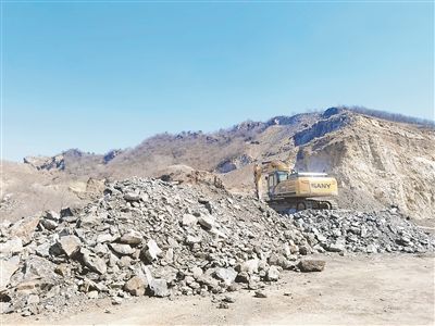 在兴隆县帅宝矿业公司水泉甸子石灰岩、铝土矿矿区一处作业场坪,露天堆放着部分矿石余料。贺鸣 摄