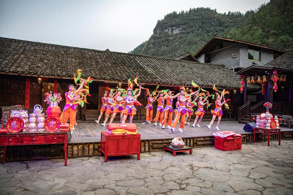 土家民俗歌剧院里,演出人员在表演土家族舞蹈。新华社记者黄伟 摄