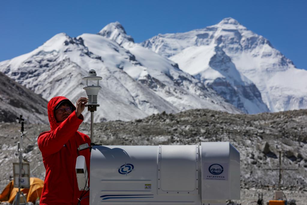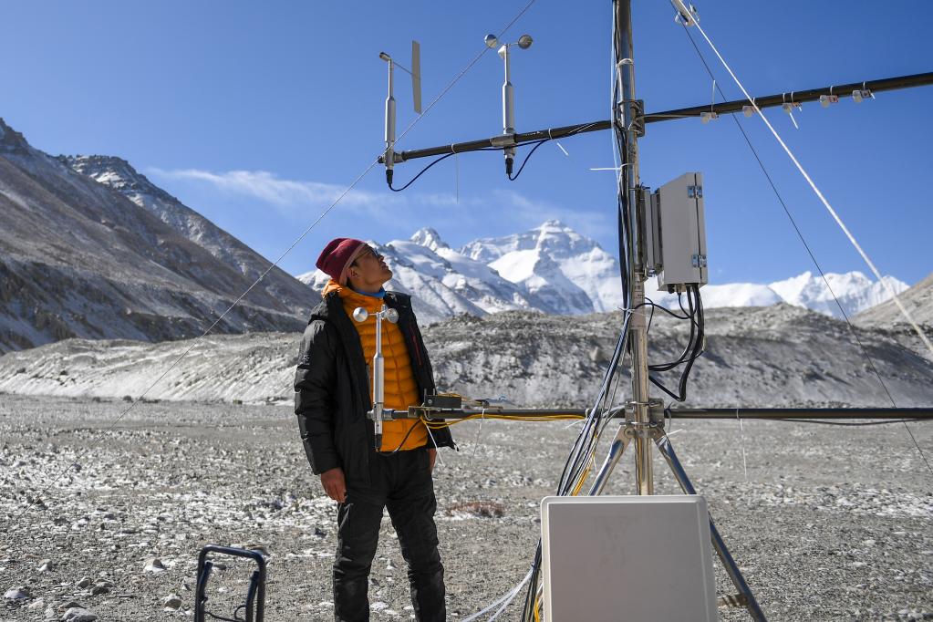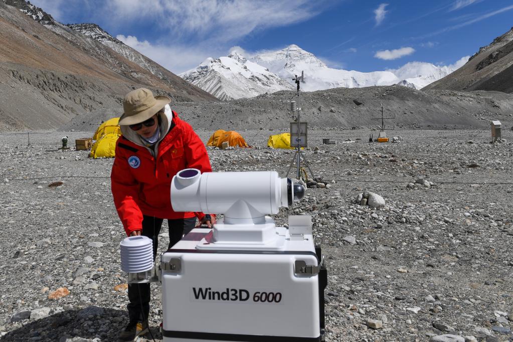 5月2日,在珠峰登山大本营,科研人员检查测风雷达。新华社记者 姜帆 摄