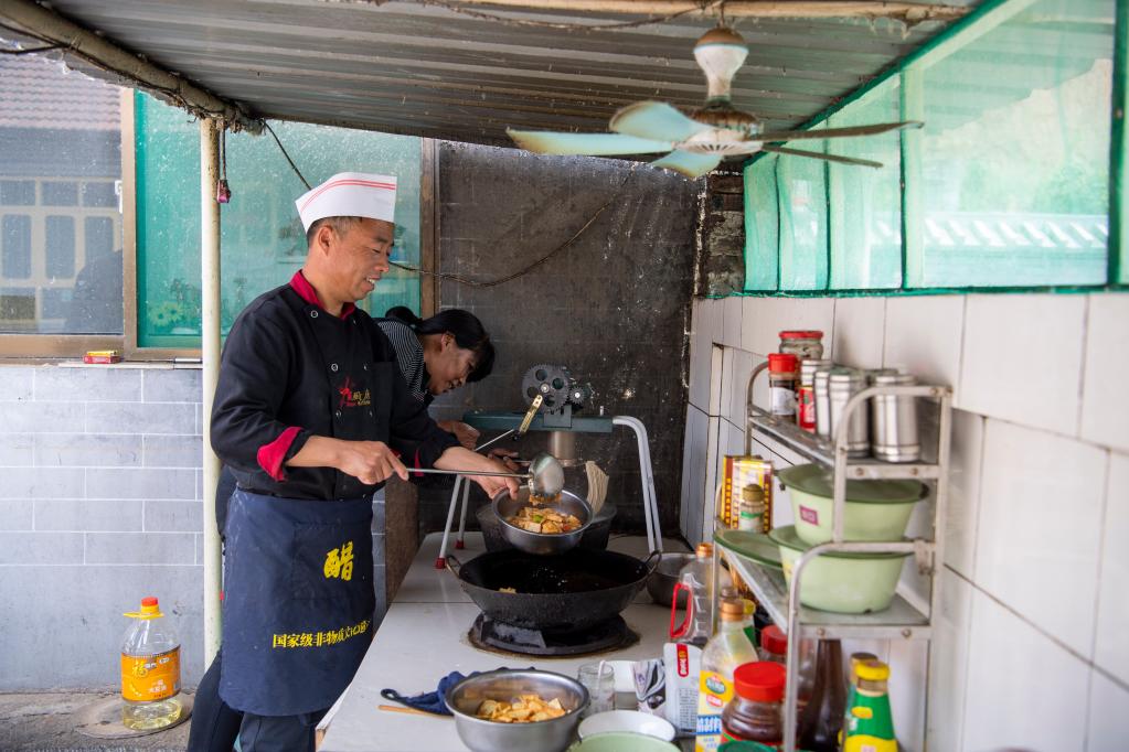 5月18日,在山西省长治市武乡县砖壁村,村民张国兵(左)在自家的农家乐里为客人准备饭菜。新华社记者杨晨光摄