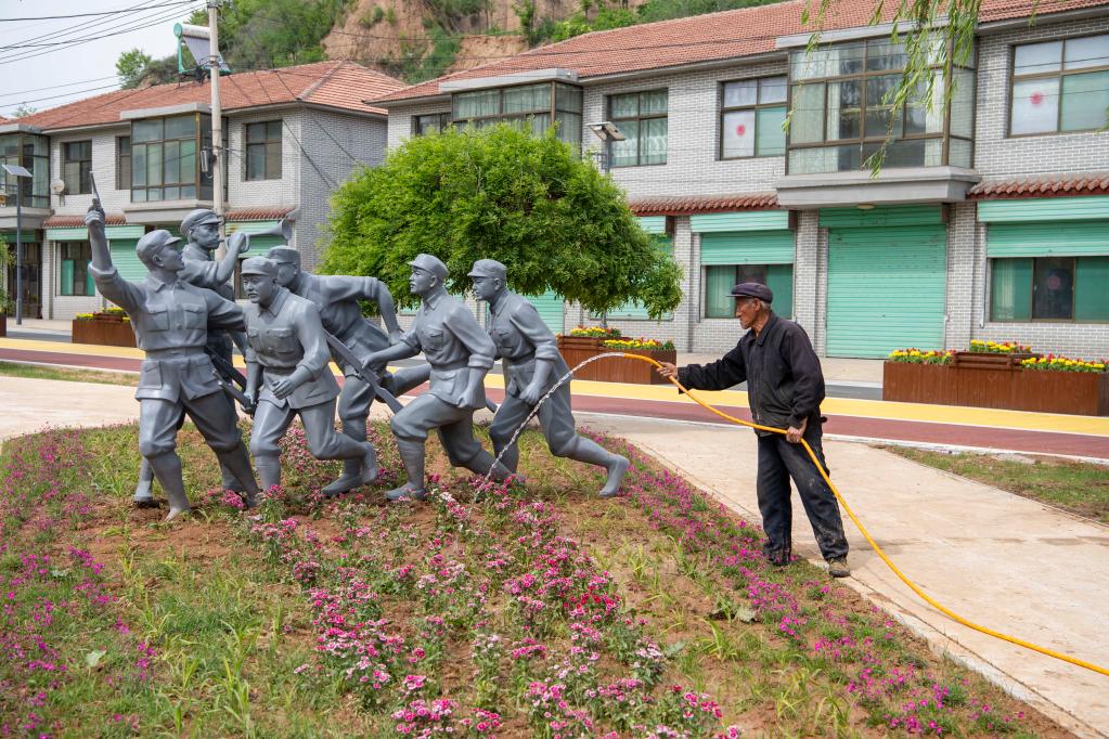 5月18日,在山西省长治市武乡县王家峪村,村民胡树青在为村里的植被浇水。新华社记者杨晨光摄