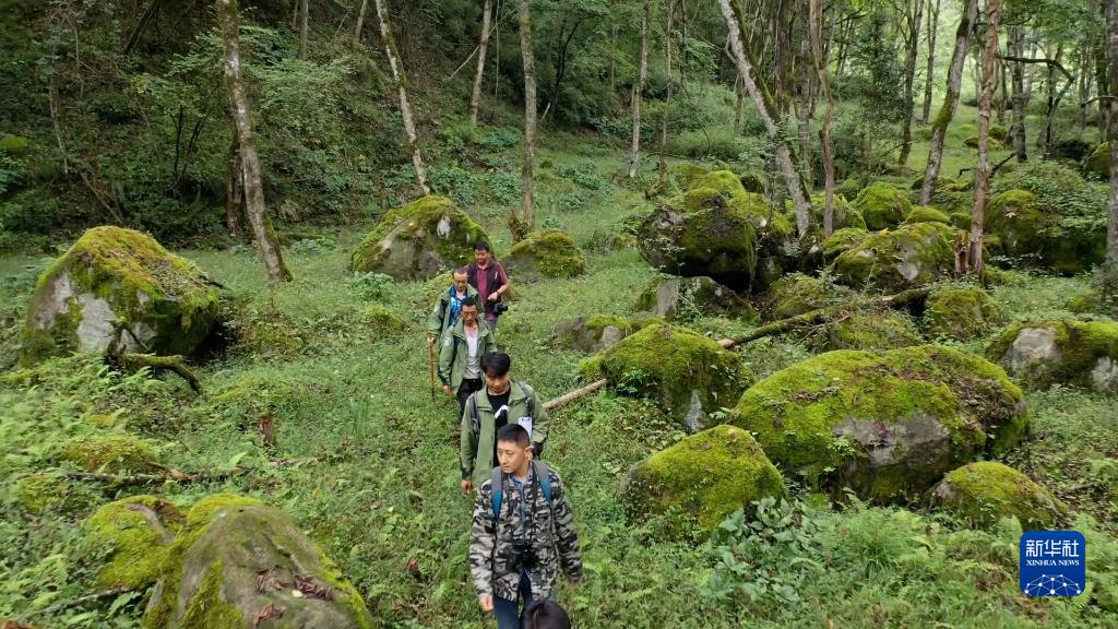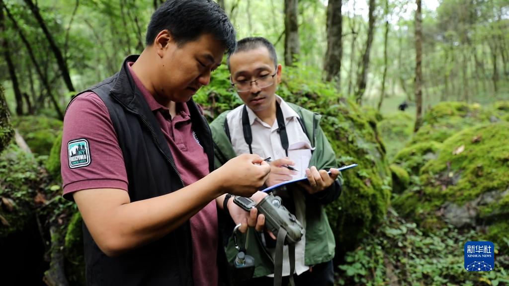 工作人员在大熊猫国家公园唐家河片区内更换野外红外相机电池及储存卡(资料照片)。新华社发