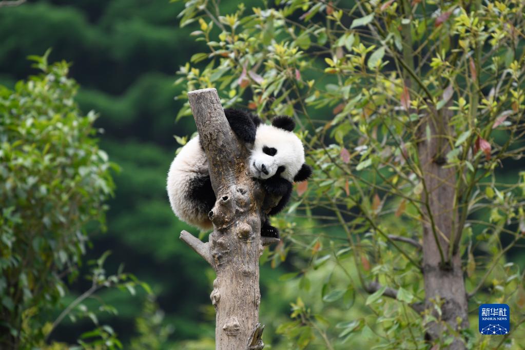 在中国大熊猫保护研究中心卧龙神树坪基地内,一只大熊猫在树上休息(4月24日摄)。新华社记者 胥冰洁 摄
