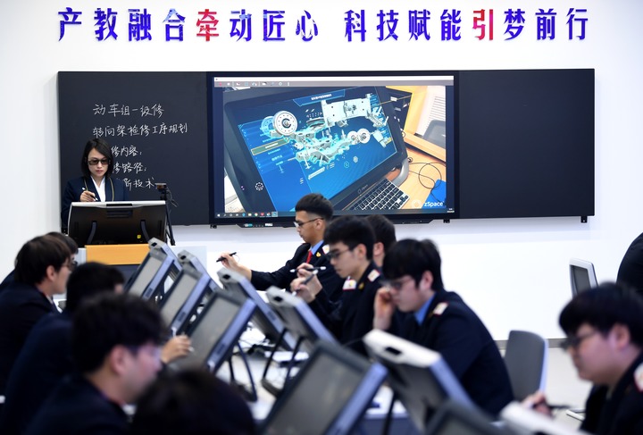2022年4月29日,在西安铁路职业技术学院,学生在动车组VR智慧课堂上模拟检修。新华社记者 李一博 摄