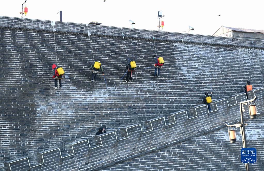 劳动者在河北正定古城南城门清洁城墙墙面(2022年1月2日摄)。新华社发(陈其保 摄)