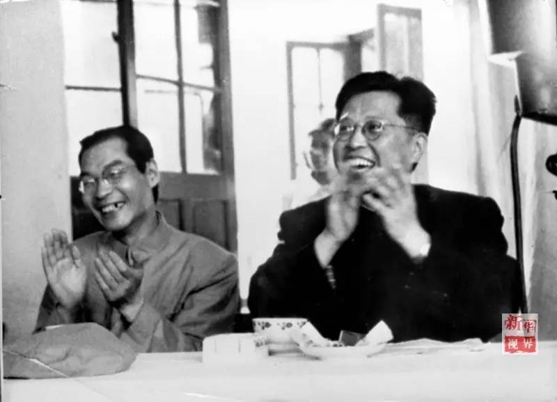 1954年6月,曹禺(右)和著名戏剧家、导演焦菊隐参加北京人艺院庆大会。新华社发
