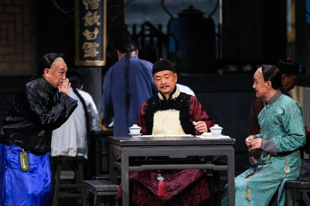 6月9日,人艺经典剧目《茶馆》在首都剧场恢复线下首场演出。图为演员濮存昕(中)、冯远征(右)、何冰(左)在台上表演。新华社记者彭子洋摄