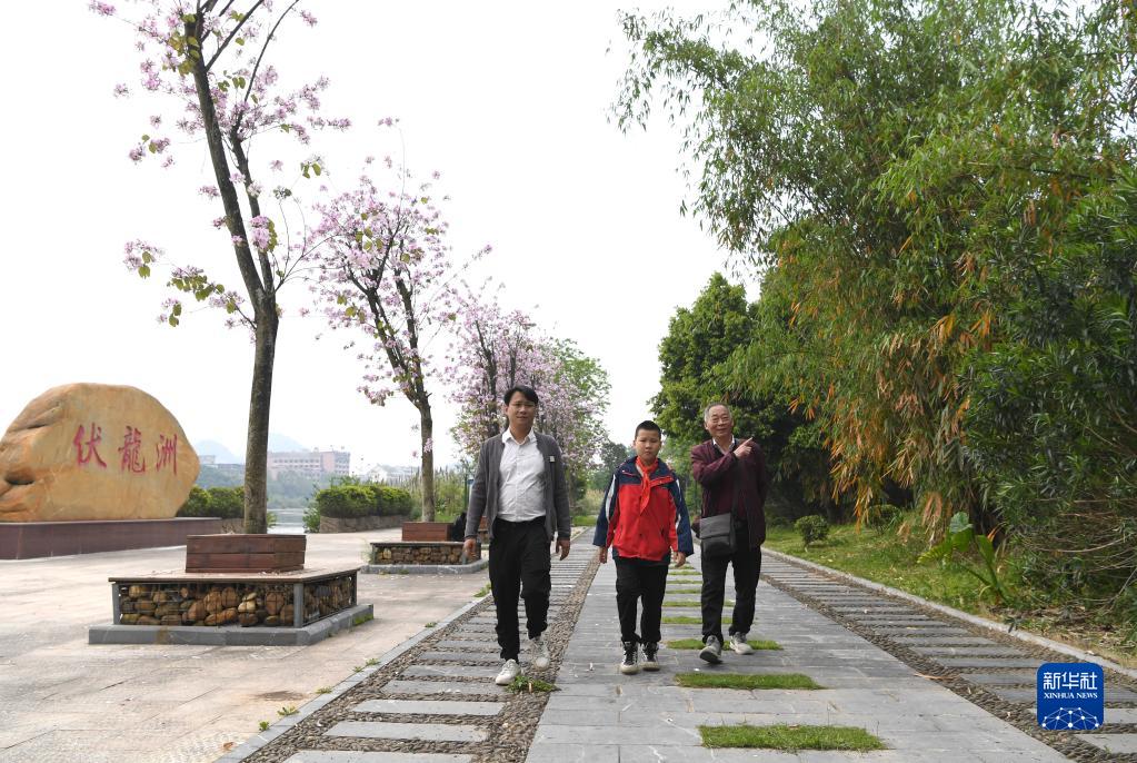 伏龙洲原居民黄岗(右)带着儿子、孙子重回改造后的伏龙洲游玩(4月10日摄)。新华社记者 周华 摄
