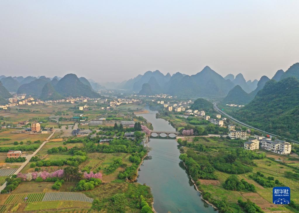 广西桂林阳朔县境内的漓江支流遇龙河风光(4月11日摄,无人机照片)。新华社记者 周华 摄