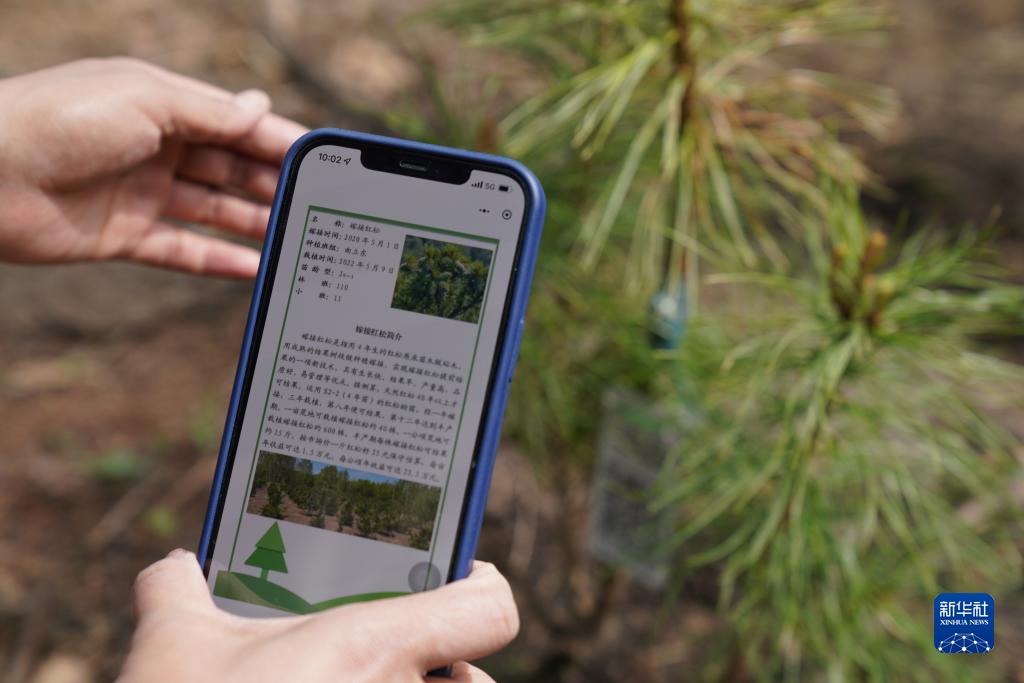 在黑龙江伊春森工集团上甘岭林业局公司的一处红松嫁接育苗基地,游客扫码查看嫁接红松简介(5月19日摄)。新华社记者王松摄