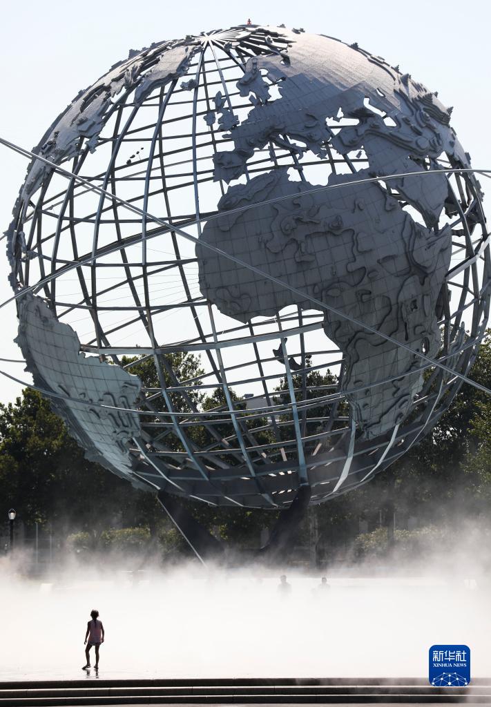 2021年8月13日,一名儿童冒着高温天气站在美国纽约科罗纳公园水雾广场的地球模型前。新华社记者 王迎 摄