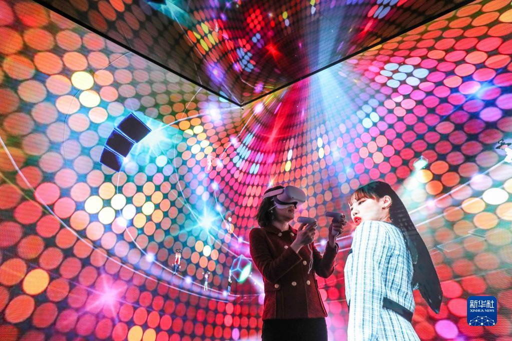 2022年3月1日,一名女子在西班牙巴塞罗那2022世界移动通信大会上通过虚拟现实技术在“元宇宙”中体验音乐会。新华社记者 郑焕松 摄