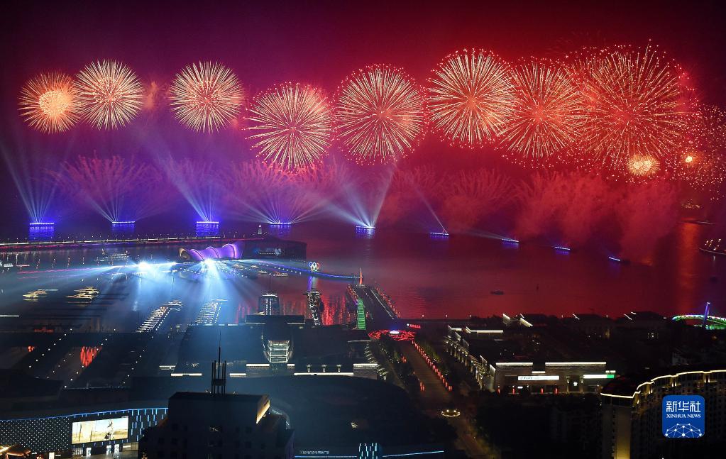 这是上合组织青岛峰会期间举行的《有朋自远方来》灯光焰火艺术表演(2018年6月9日摄)。新华社记者 李紫恒 摄