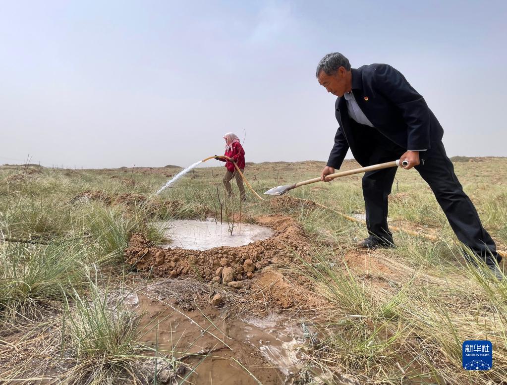 甘肃省武威市古浪县八步沙林场场长郭万刚(右)与林场职工为新种树苗浇水(5月6日摄)。新华社记者 郭刚 摄
