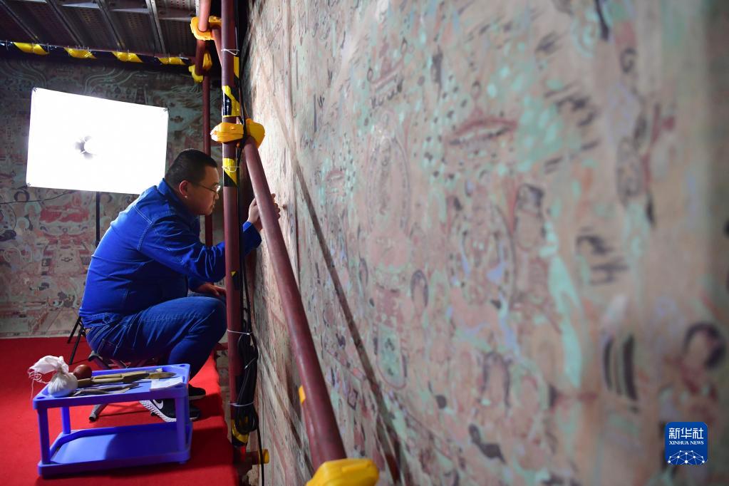 敦煌研究院文物保护技术服务中心壁画修复师杨金礼在莫高窟第231窟内修复出现病害的壁画(4月19日摄)。新华社记者 陈斌 摄