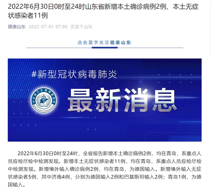 2022年6月30日0时至24时山东省新增本土确诊病例2例、本土无症状感染者11例