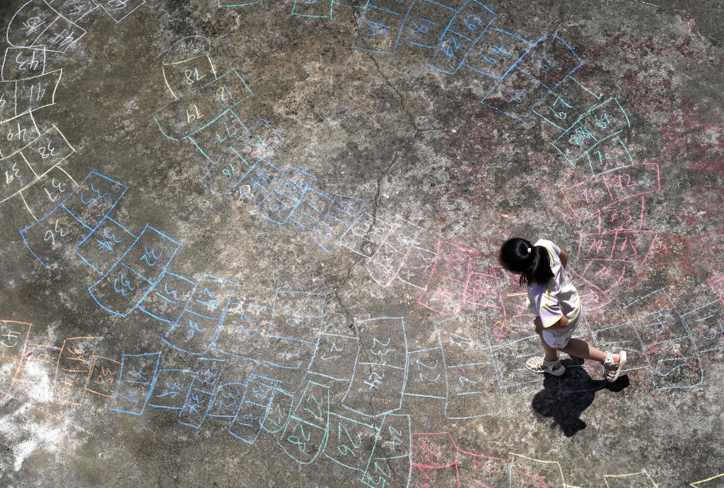 在江西省武宁县鲁溪镇梅颜村,留守儿童毕梓萱一个人在家中院子里“跳房子”。新华社记者 万象 摄