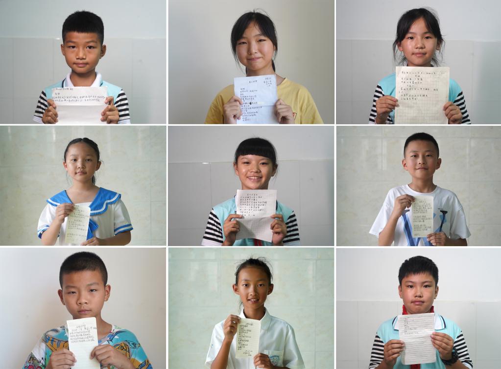 孩子们正在展示自己写的童诗(拼版照片)。新华社记者 万象 摄