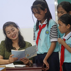 在江西省武宁县澧溪镇中心小学,志愿者陈燕燕(左二)正在给孩子们讲解诗歌的创作技巧。新华社记者 万象 摄