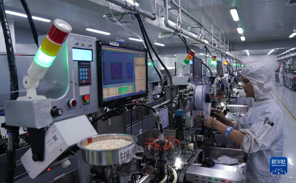江西兆驰光元科技股份有限公司的工作人员在车间进行LED封装编带工序(2021年6月25日摄)。新华社记者 胡晨欢 摄
