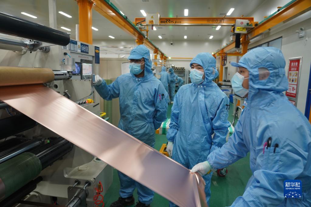 在位于江西南昌高新区的江铜耶兹铜箔有限公司,工人进行锂电铜箔分切工序(2022年5月12日摄)。新华社记者 周密 摄