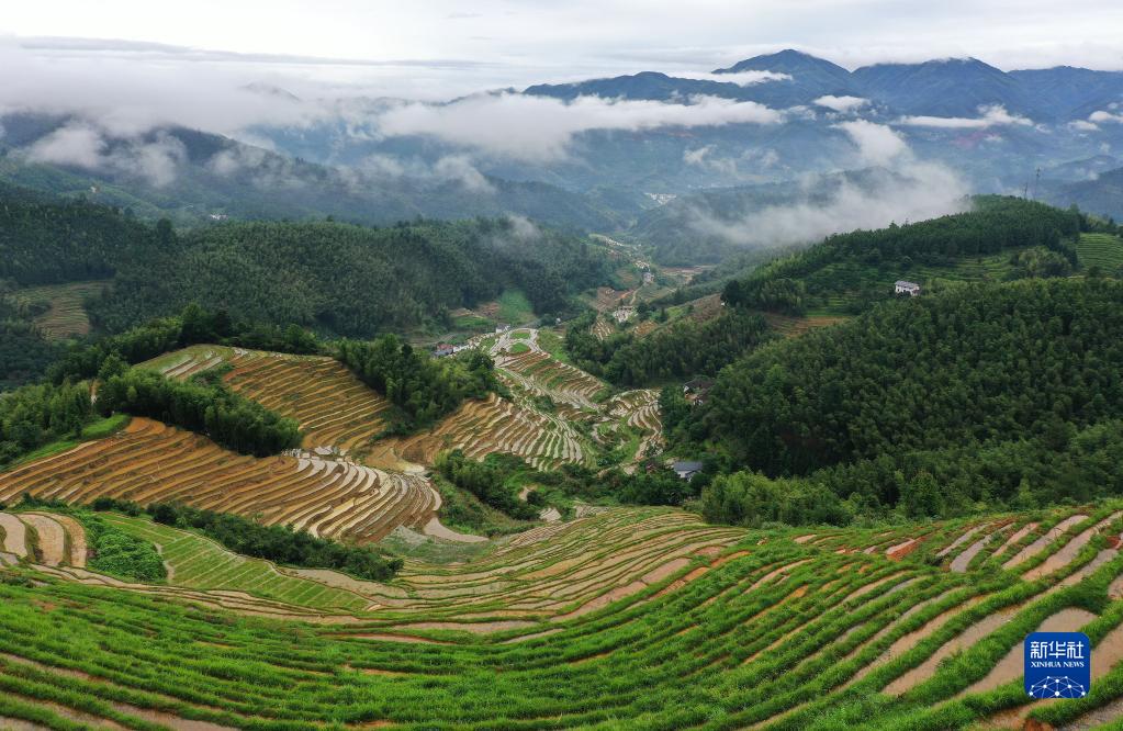 这是江西省赣州市崇义县上堡梯田(2022年6月16日摄,无人机照片)。新华社记者 万象 摄