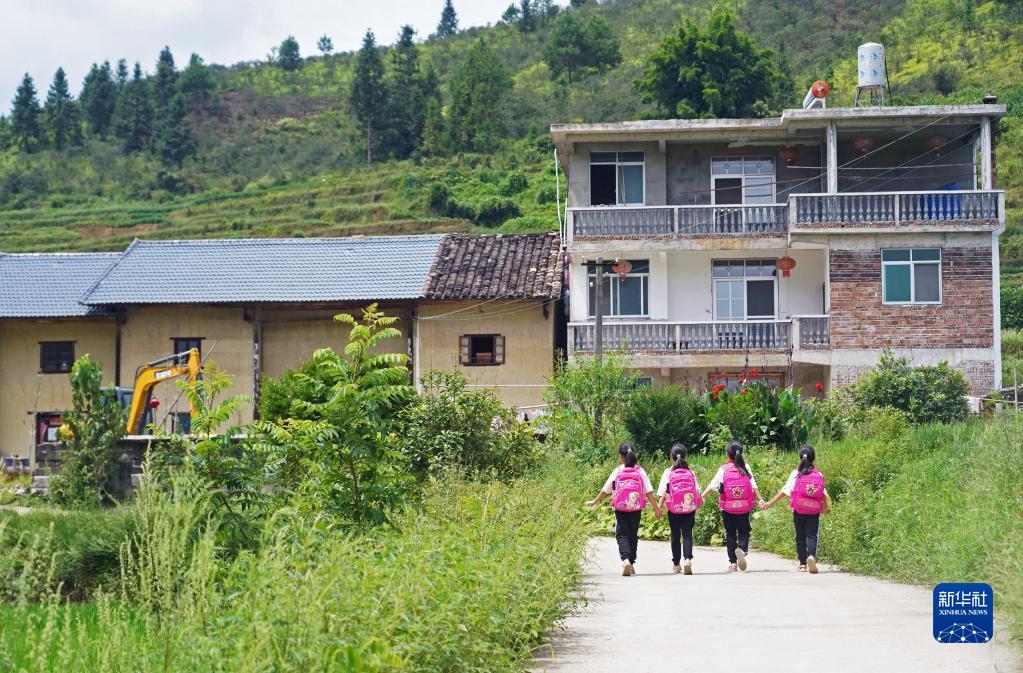 在江西省赣州市崇义县上堡乡上堡村,孩子们走在放学回家的路上(2020年9月10日摄)。远处是一户村民的土坯房祖屋和新建的三层小楼。新华社记者 万象 摄