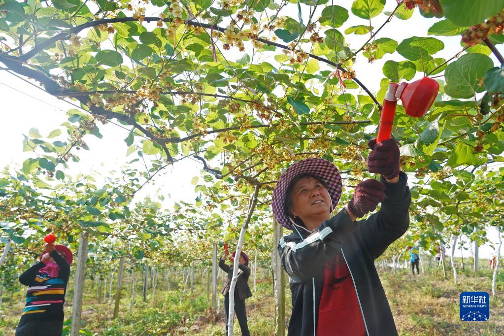 在位于江西宜春市奉新县赤岸镇城下村的“初心园”猕猴桃产业扶贫基地,村民为猕猴桃果树进行人工授粉(2020年4月29日摄)。新华社记者 万象 摄