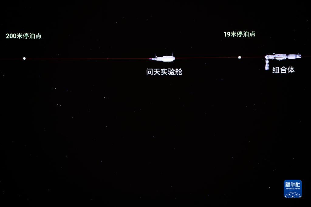 7月25日在北京航天飞行控制中心拍摄的问天实验舱与空间站组合体交会对接。这是问天实验舱从19米停泊点向天和核心舱前向端口靠近。新华社记者 郭中正 摄