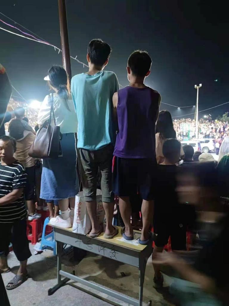 等到比赛开打,球场内人山人海、座无虚席,球场外的山坡上、屋顶上,只要能站住脚的地方都是观众,“乡里的梯子都卖空了”,村民笑着说。