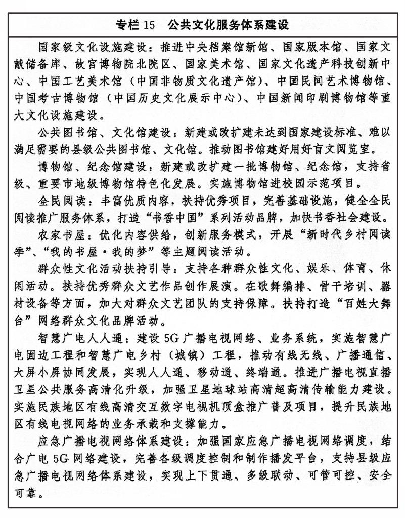 落实国家基本公共服务标准要求,加强基层文化建设,增加供给总量,优化供给结构,推动优质公共文化资源向农村地区、革命老区、民族地区、边疆地区倾斜,缩小城乡和地区之间公共文化服务差距,推动巩固拓展脱贫攻坚成果同乡村振兴有效衔接。加强民族地区公共文化建设,扶持民族地区新闻出版事业发展,加强少数民族语影视译制,加强民族地区广播电视传输覆盖保障及涉农等节目制作译制传播。推动直播卫星电视频道高清化进程。加强“三区三州”市级广播电视播出机构融合发展能力建设。培育和发展农村院线,促进新片大片进入农村市场。丰富老年人、进城务工人员、农村留守妇女儿童、残疾人的公共文化供给,保障特殊群体的基本文化权益。