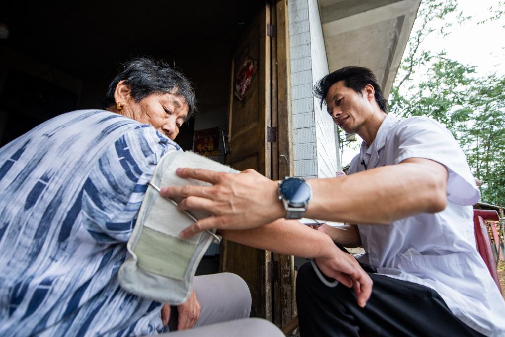 8月17日,尹传波在为村民尹秋华测量血压。新华社记者伍志尊 摄