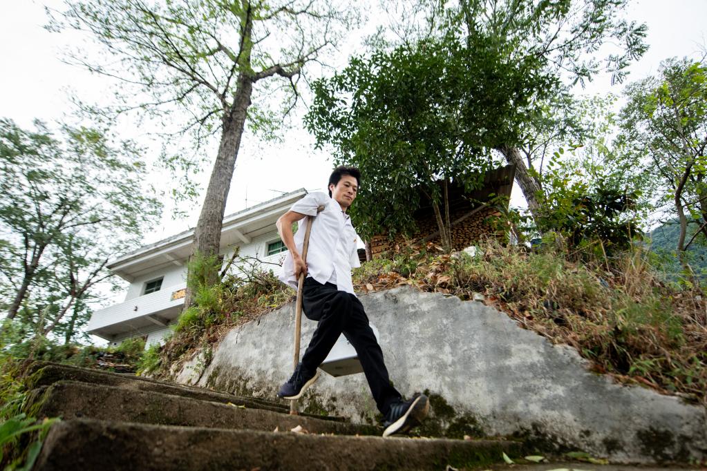 8月17日,尹传波一手拄拐杖,一手提药箱,正前往村民家中。新华社记者伍志尊 摄